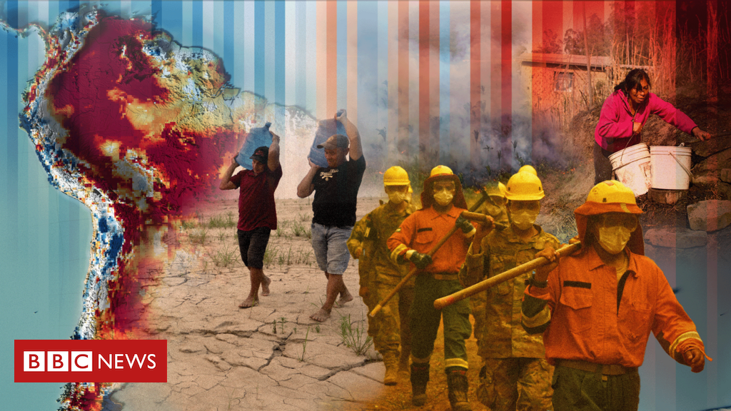 Imagem composta de um mapa da América do Sul, bombeiros e pessoas carregando recipientes com água devido a secas ou incêndios