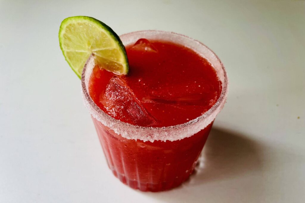 • Coloque o suco de limão e o gelo no copo. Encha de gelo e complete com o suco de melancia. Misture delicadamente e sirva