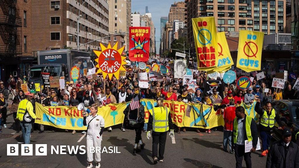 Muitos dos manifestantes carregavam faixas e cartazes, alguns com os dizerem “No Kings”, em uma referência à campanha que dá nome aos protestos, organizada por uma coalizão de grupos de esquerda.