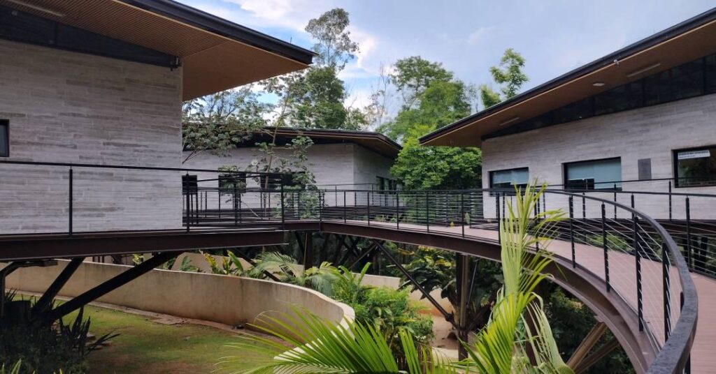 Conforme adentrava a floresta, surgiu a estrutura com quatro edifícios suspensos sobre o matagal que levou até prêmio: em 2023, o projeto do laboratório ganhou na categoria “Pequeno Porte” do Prêmio Talento Engenharia Estrutural. Ali me juntei aos outros visitantes, um grupo composto principalmente por famílias com crianças acompanhadas dos pais, tios e avós. Éramos em 15 pessoas, sendo que as visitas acontecem com no máximo 20 por sessão.