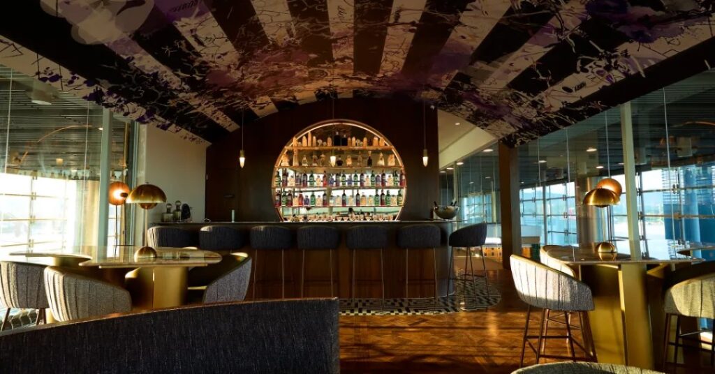 No andar superior, há um mezanino com vista para a pista de decolagem, café, bar com carta de drinques e buffet com menus inspirados em destinos ao redor do mundo – o cardápio é assinado pelo Grupo Charlô.