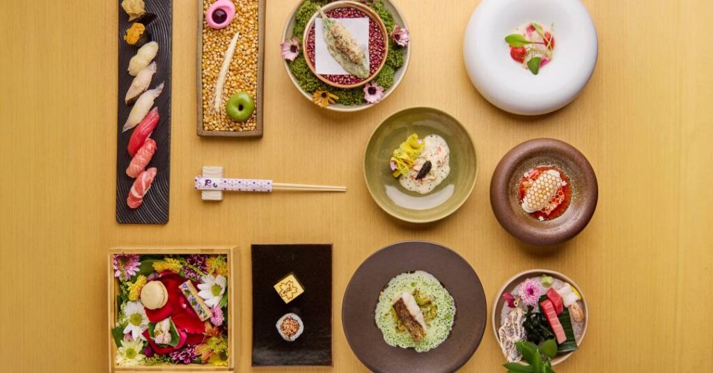 Segue com o creme de caranguejo no brioche da casa cozido no vapor e coberto caviar, o tempurá de peixinho da horta com cobertura de carne de wagyu ao molho teriyaki com cogumelos enoki e trufa branca italiana, o tofu de gergelim no caldo de kombucha com wassabi fresco japonês e a seleção de sushis e sashimis, único item fixo.