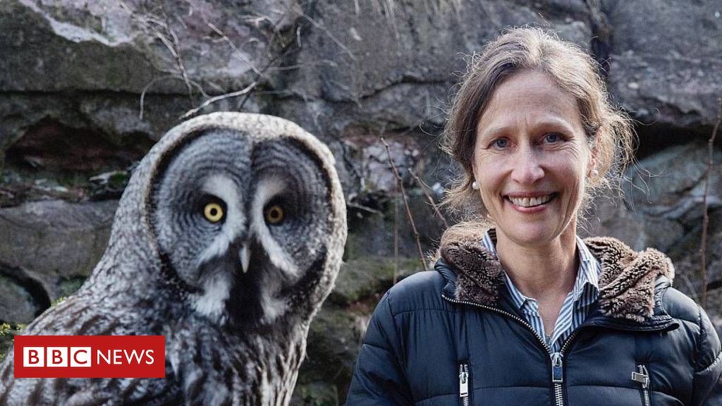 Legenda da foto, Jennifer Ackerman ao lado de uma coruja-cinzenta (Strix nebulosa)