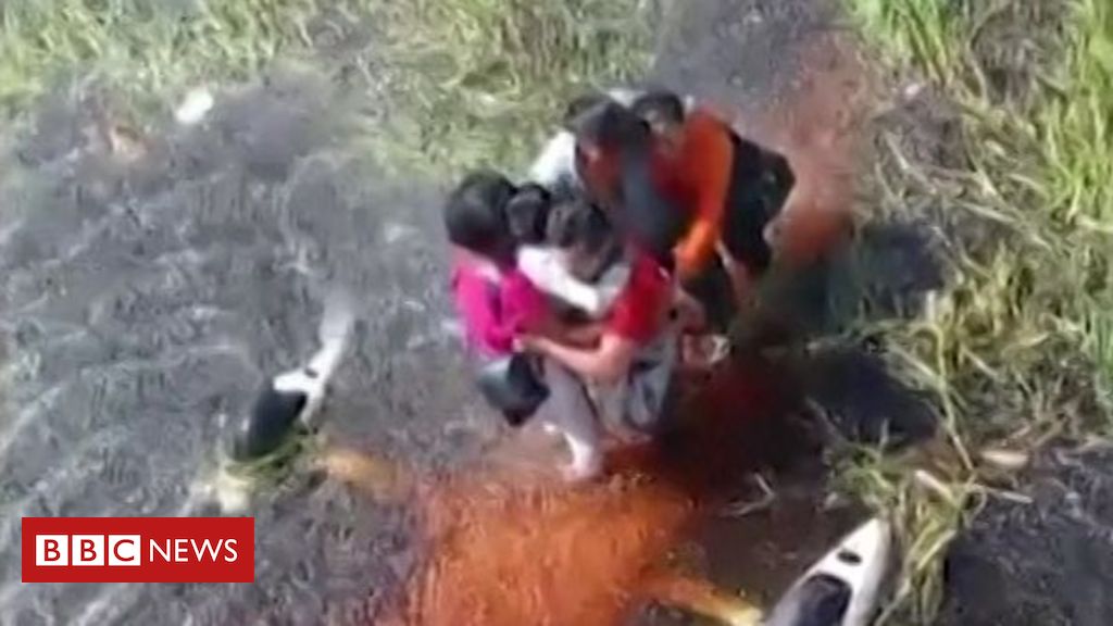 imagem feita a partir de helicoptero mostra passageiros abraçados em meio a um pântano
