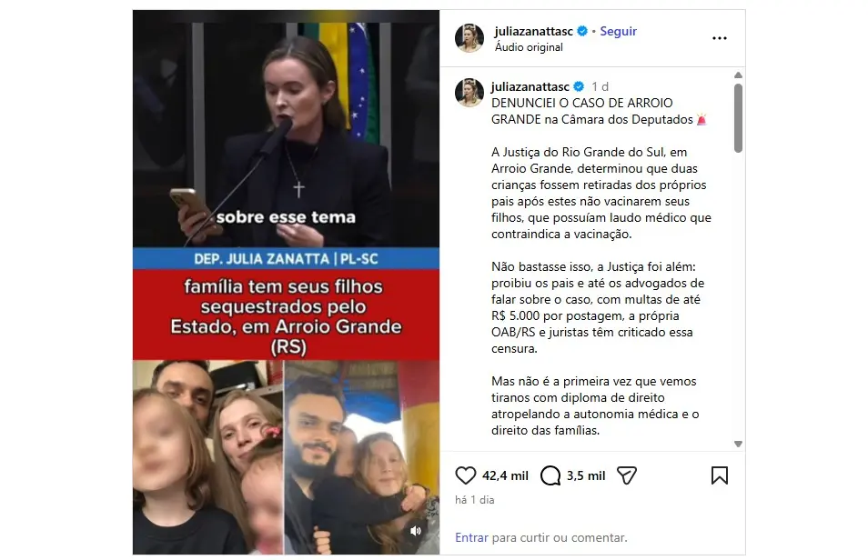 O caso também foi apresentado na Câmara dos Deputados pela parlamentar Júlia Zanatta (PL-SC). Mesmo não representando o Rio Grande do Sul na Casa, a parlamentar citou preocupação em relação à interferência do Estado em decisões que cabem aos pais e criticou o grau de sigilo do processo.