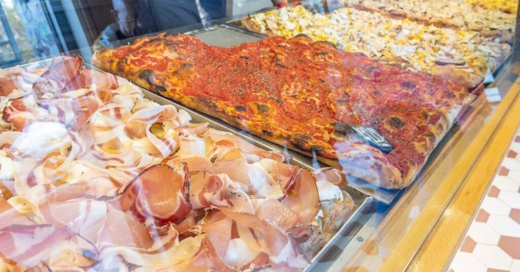 Em pleno gueto judaico, pizza al taglio em seu essencial: massa fina extremamente crocante coberta com molho de tomate, azeite, sal e nada mais. Uma fatia sobre a outra pra comer feito sanduíche. O preço? Apenas € 3,50 .