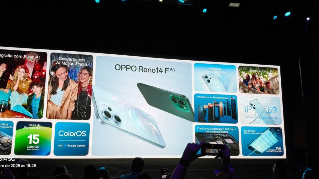 O Oppo Reno 14 F tem suporte a 5G, NFC, até 8 GB de RAM, 256 GB de armazenamento e proteção IP68. O celular começa a ser vendido nesta quarta-feira por R$ 3,5 mil.