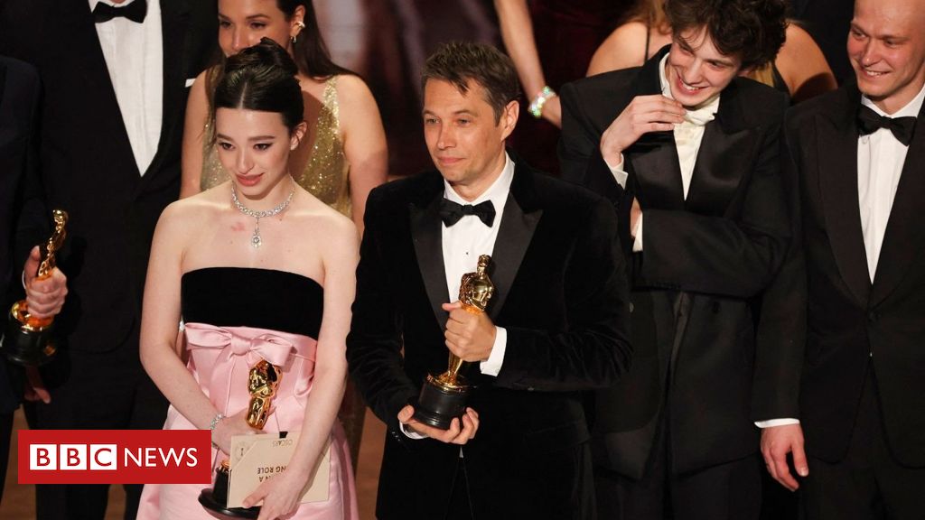 Legenda da foto, Equipe de Anora no Oscar, incluindo a protagonista Mikey Madison e o diretor Sean Baker; filme levou cinco estatuetas