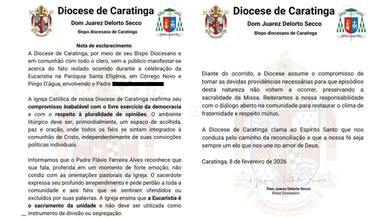 “A Igreja Católica de nossa Diocese de Caratinga reafirma seu compromisso inabalável com o livre exercício da democracia e com o respeito à pluralidade de opiniões”, afirmou a nota, ao pontuar que “o ambiente litúrgico deve ser, primordialmente, um espaço de acolhida, paz e oração, onde todos os fiéis se sintam integrados à comunhão de Cristo, independentemente de suas convicções políticas individuais”.