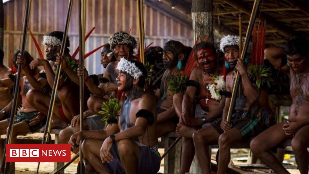 Homens com pinturas corporais e penas na cabeça se sentam em banco em uma aldeia indígena