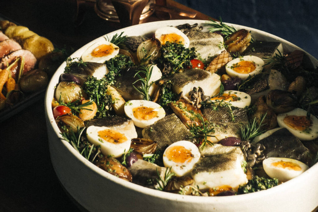 Conta com pratos para petiscar, como canapés de roquefort com crosta de nozes e bolinhos de siri com pimenta –cada um com 12 unidades, por R$ 144. Entre as entradas, pode ser pedido o salpicão de bacalhau (R$ 220, 500 g). O peixe reaparece em três versões principais: o lombo ao forno, com batata, brócolis e azeitona preta (R$ 580, 1,2 kg), a brandade com mandioquinha palha (R$ 490, 1,5 kg) e a torta (R$ 480). O cardápio também inclui opções de massas, acompanhamentos e sobremesas.