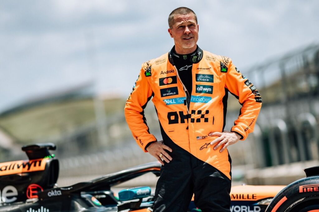 Após meses de preparação e filmagens com carros de F2 adaptados para o filme F1, o ator e produtor Brad Pitt assumiu o volante de um carro oficial de Fórmula 1. Ele foi convidado pela McLaren para pilotar o MCL60, carro usado pelo time em 2023, no Circuito das Américas, em Austin, nos EUA.