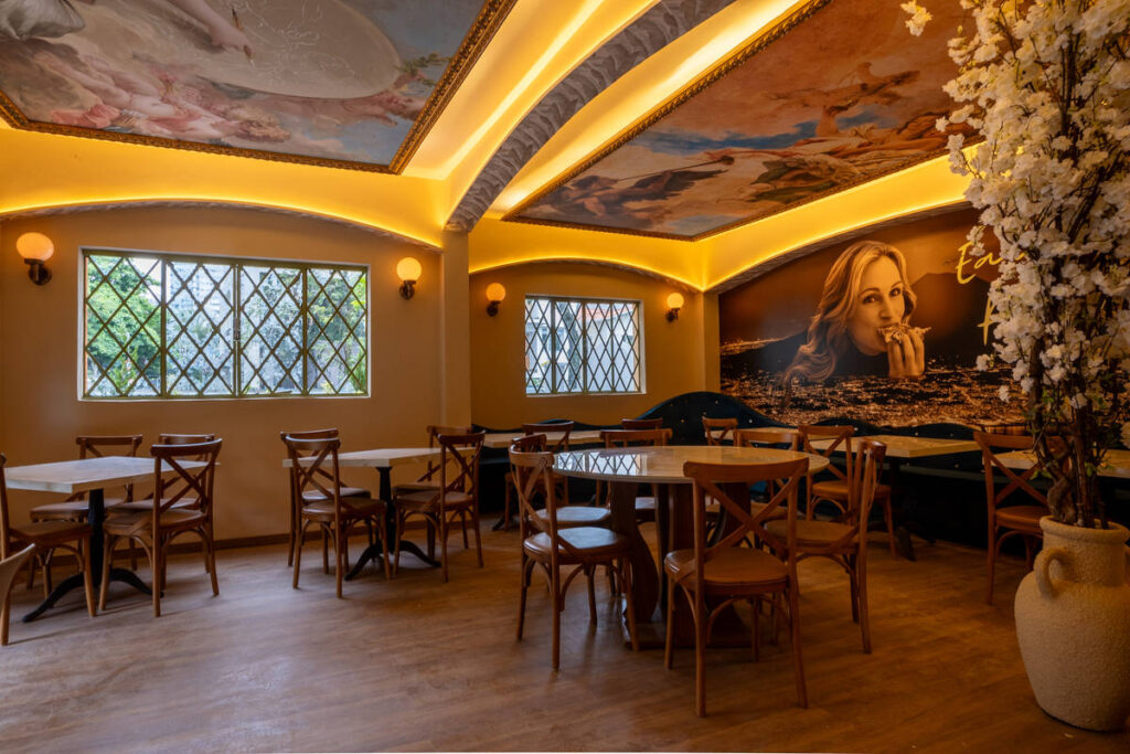 Uma cena da atriz no longa ganhou espaço em uma das paredes do salão da unidade brasileira. A pizzaria, instalada em um sobrado construído na década de 1940 em Pinheiros, conta com decoração que remete a mansões napolitanas e pinturas renascentistas.