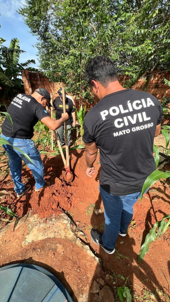 O corpo da vítima, Fabrício Gomes Ramos, foi localizado nesta sexta-feira (14), enterrado no quintal de uma casa no bairro João China, em Araputanga. Os restos mortais foram recolhidos pela Politec para exames periciais.