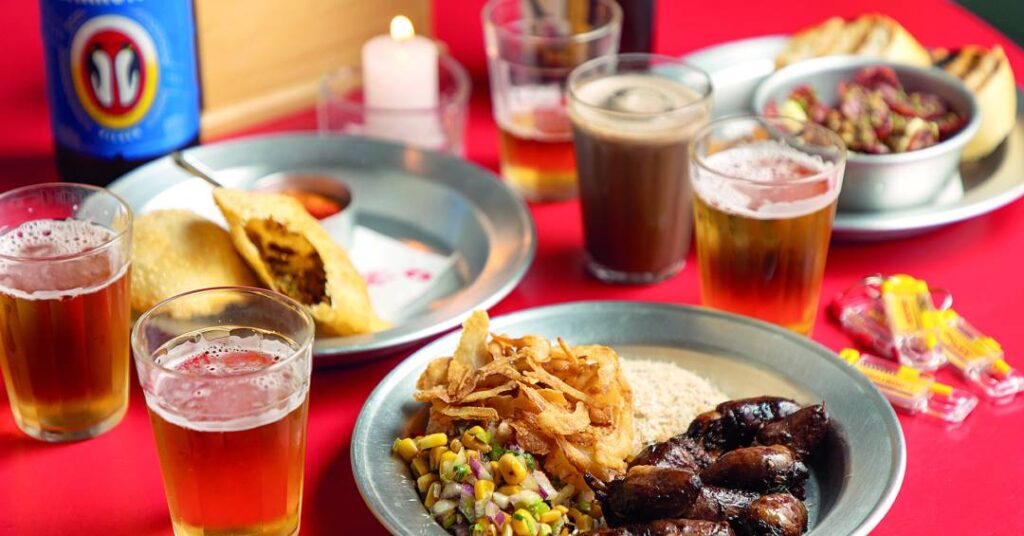 O trio de acompanhamentos é composto de vinagrete de milho tostado, salada de batata e farofa de cebola. Pastéis como o de picadinho de carne (R$ 20,00 a dupla média) deixam a experiência de boteco ainda mais gostosa.