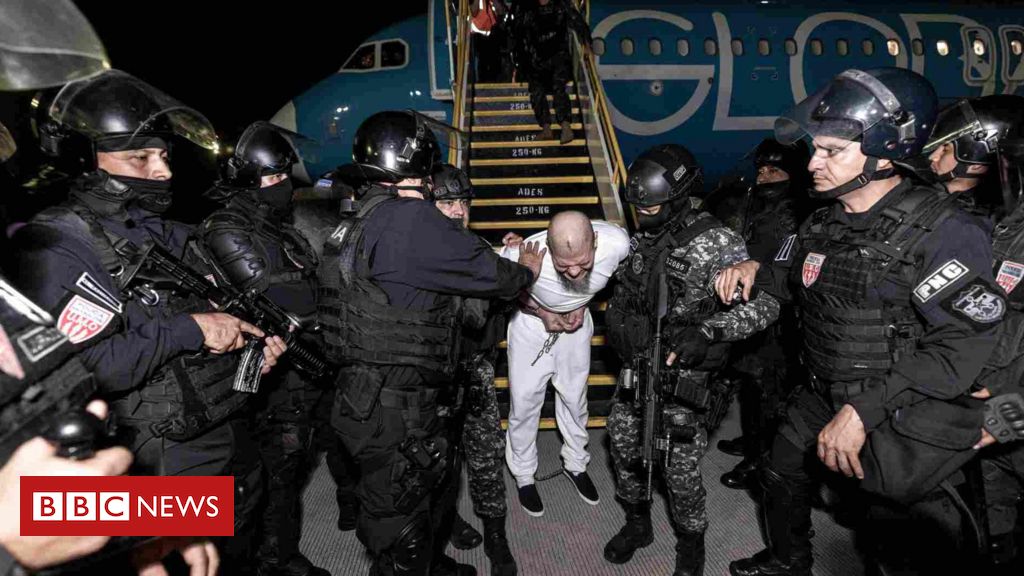 Um vídeo postado por Bukele nas redes sociais mostra fileiras de homens algemados sendo escoltados para fora do avião por agentes armados.
