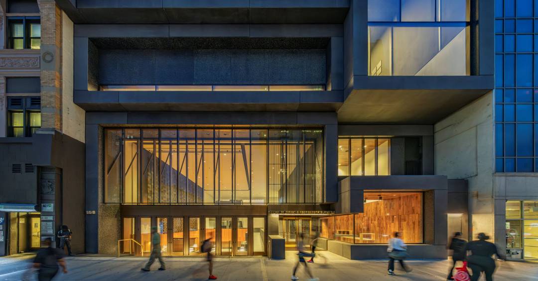 Maryna Ponomarenko, 40, funcionária de um jardim de infância, sorri enquanto fica de pé e observa crianças sentadas a uma mesa comendo em tigelas, em 10 de outubro de 2025. Elas estão dentro de um abrigo antiaéreo, e a cabeça de Ponomarenko quase encosta no teto. Recortes de papel multicoloridos em forma de pássaros estão colados nas paredes verde-claras. Ao fundo, uma mulher está sentada com uma menina reclinada em seu colo e outra criança à esquerda puxando o cordão da calça. Desenhos feitos à mão estão pendurados em prendedores fixados a tubulações.