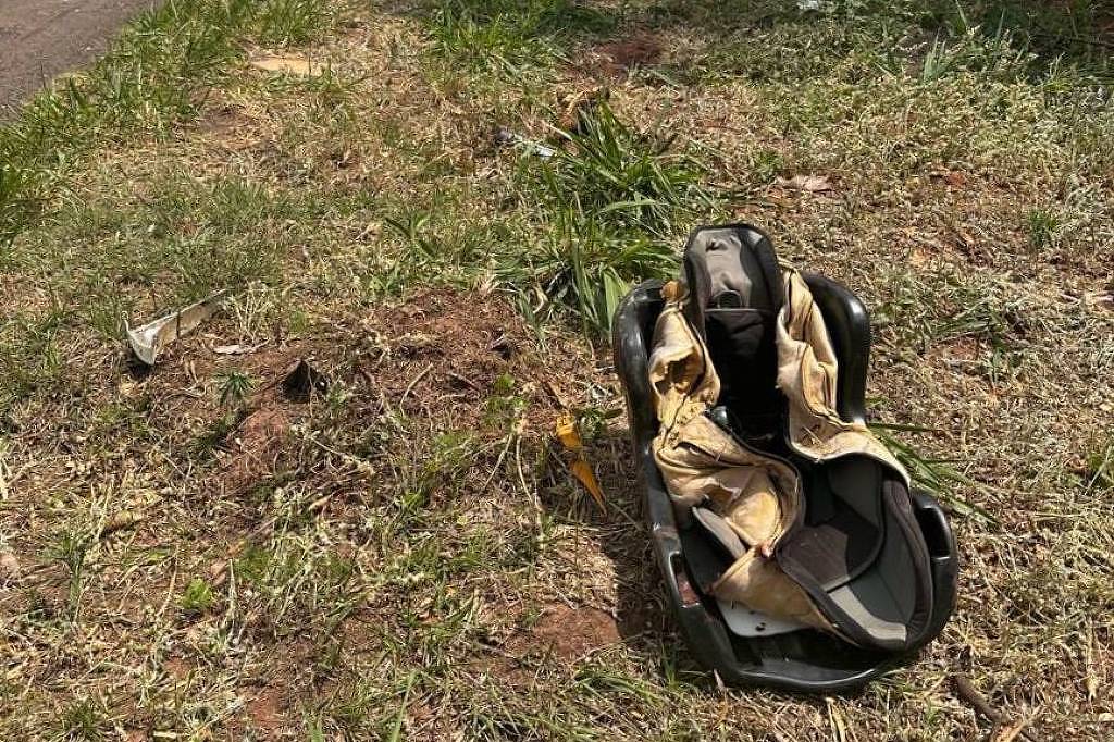 Nas imagens divulgadas pela corporação, é possível ver a cadeirinha caída na beira da estrada, distante do veículo destruído, que parou na margem após sair da pista.