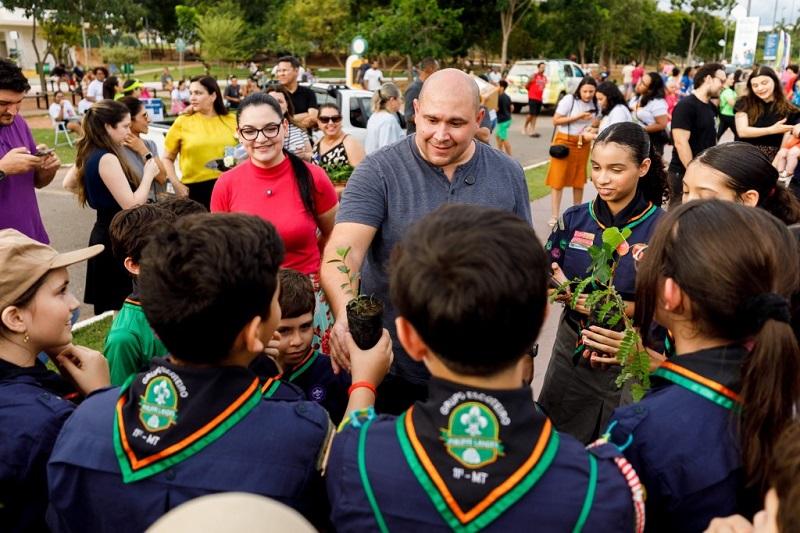 A foto mostra o prefeito de Cuiabá Abilio Brunini e a primeira-dama Samantha Iris no Parque das Águas, em Cuiabá, durante a programação do Dia Mundial da Água. No momento, estão conversando com crianças e adolescentes do grupo de escoteiros Felipe Lanes. O local está composto por muitas pessoas, que acompanham o evento.