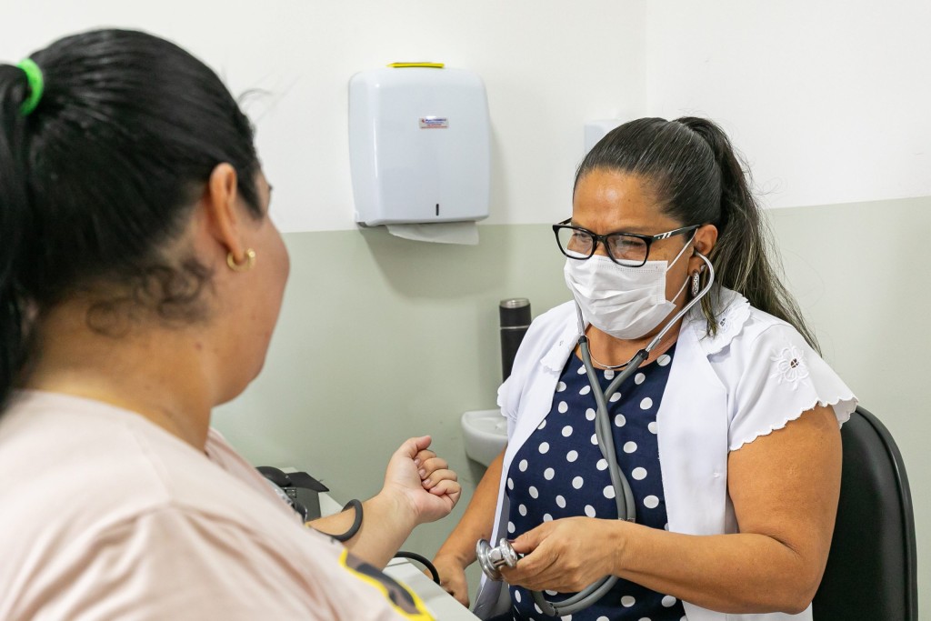 A imagem mostra uma paciente mulher sendo atendida em uma unidade de saúde de Cuiabá.