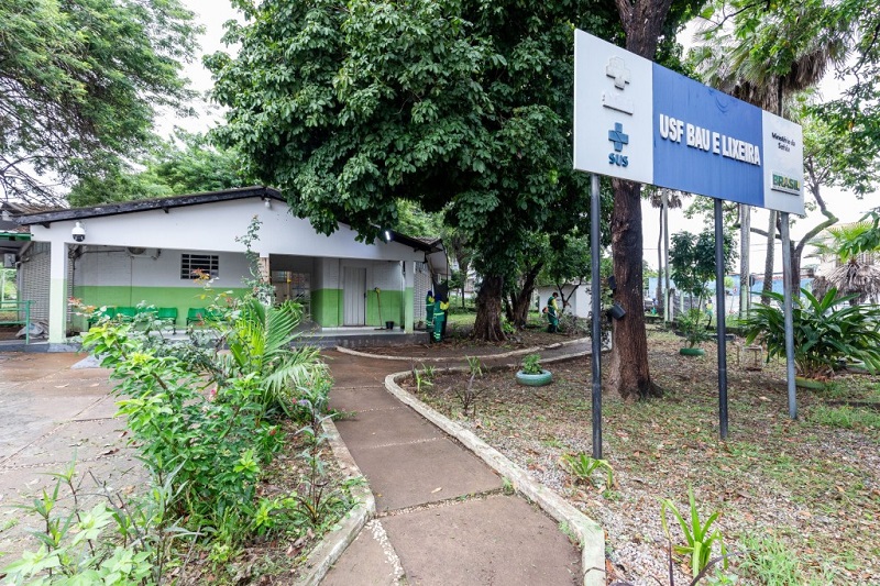 A imagem mostra a fachada da USF do bairro Lixeira. Ao fundo, três colaboradores da Limpurb realizam a limpeza do espaço.