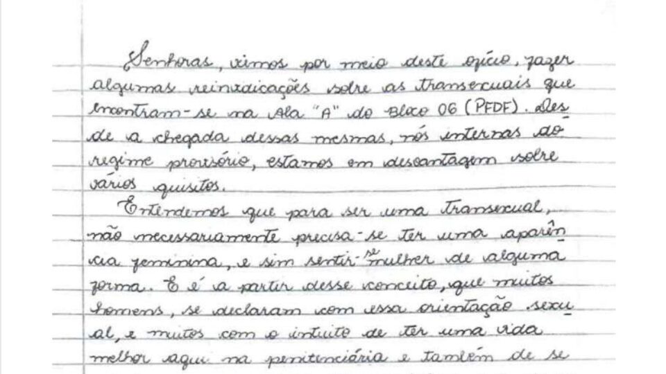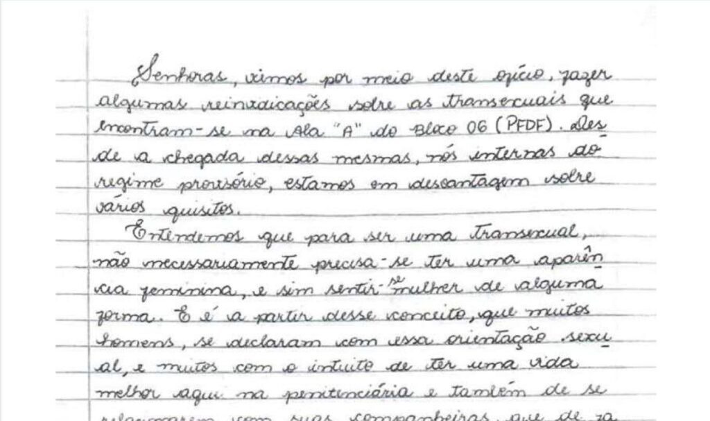 Na denúncia, as presas afirmam que o Ministério Público, em visita à penitenciária em 2 de julho de 2021, negou atenção ao pedido das internas do regime provisório, seguindo “para a ala dos transexuais, dando atenção aos seus pedidos de reivindicações”.