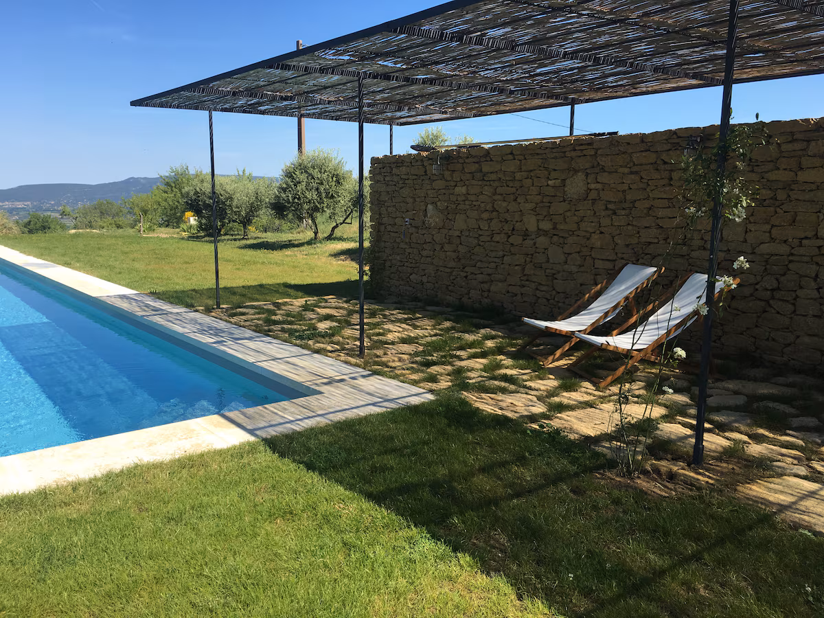 A casa: De frente para o maciço do Luberon, esta casa de campo chama atenção pelo charme rústico das paredes de pedra e pelos cômodos com linhas curvas, que dão personalidade ao lugar. O quarto principal tem cama de casal e sofazinho, sendo bastante iluminado pela luz do sol, enquanto o segundo, com cama extra, também funciona como espaço de leitura. A cozinha é totalmente equipada com ingredientes e eletrodomésticos, convidando os hóspedes a preparar um café da manhã provençal. Do lado de fora, o quintal, os terraços e a piscina são cenários perfeitos para tardes preguiçosas, conversas ao entardecer e para contemplar as paisagens que mudam ao longo do dia. Reserve aqui.