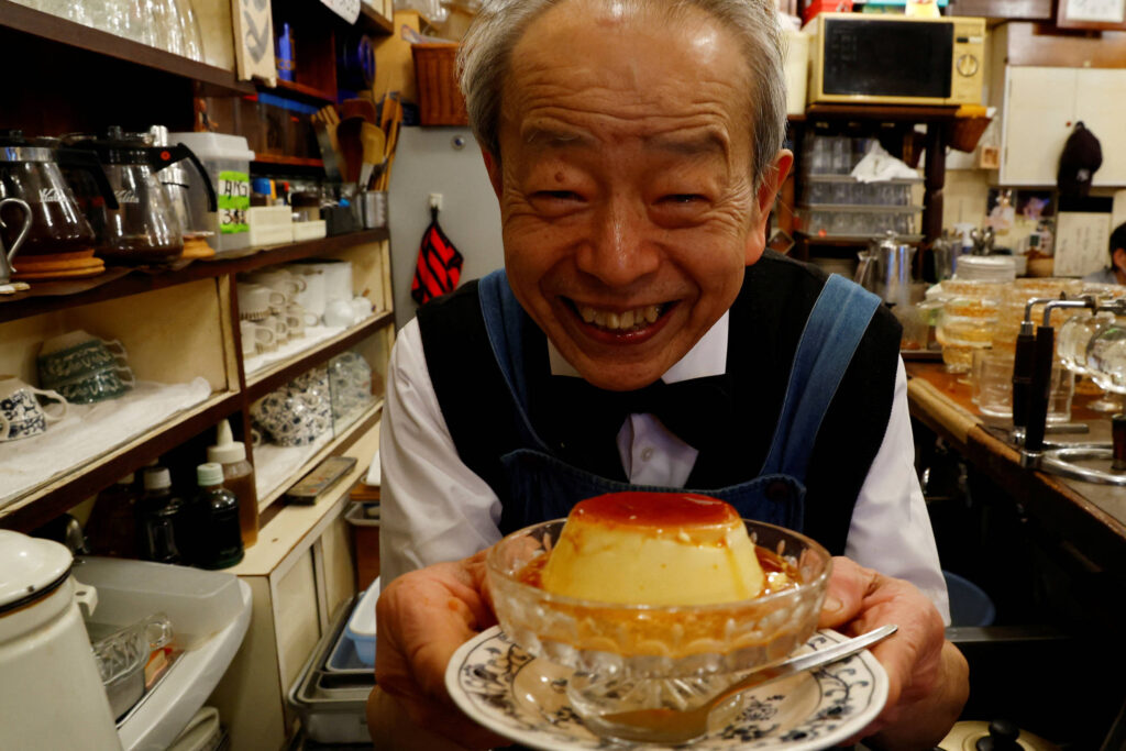 Mori, 82, viralizou em aplicativos como TikTok e Instagram, por causa da maneira ágil com que desenforma e serve pudins por trás do antigo balcão de madeira de sua kissaten –como são chamadas essas casas de café e chá no Japão.
