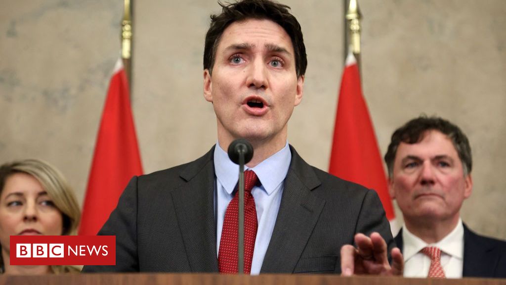 Legenda da foto, O primeiro-ministro do Canadá anunciou já na noite de sábado a imposição de tarifas de 25% sobre US$155 bilhões em produtos americanos