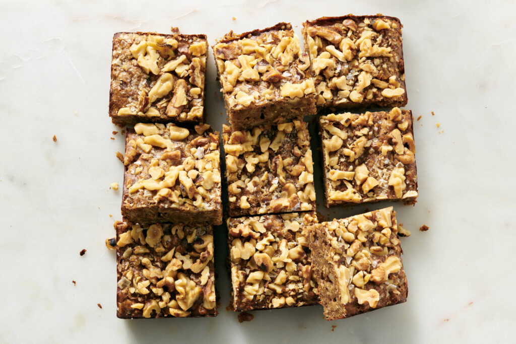 Essas barras têm uma textura macia e cremosa graças às bananas maduras e são levemente adoçadas com mel. Elas são repletas de pasta de amendoim, nozes e aveia, tornando-as um lanche matinal satisfatório.