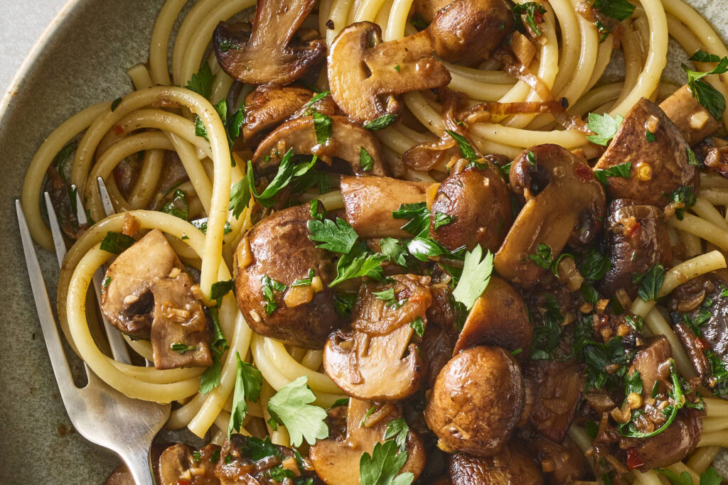 Este prato também é rico na salsinha; parte é cozida com os cogumelos e o restante é adicionada fresca, proporcionando um toque herbáceo limpo que ilumina o prato. Coma com macarrão, macarrão instantâneo ou pão.