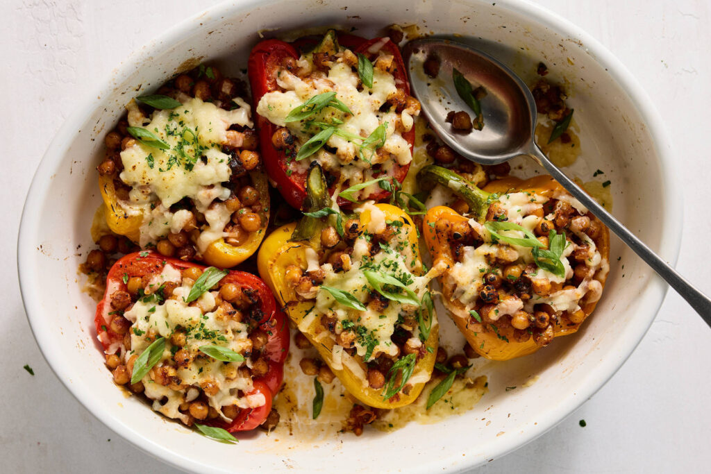 Pimentões recheados, reconfortantes e cheios de queijo, ganham uma versão vegetariana ao usar grão-de-bico no lugar da carne moída tradicional. Cominho, extrato de tomate e pimenta em pó dão profundidade e picância ao recheio, enquanto bastante cebolinha e ervas frescas trazem leveza e frescor.