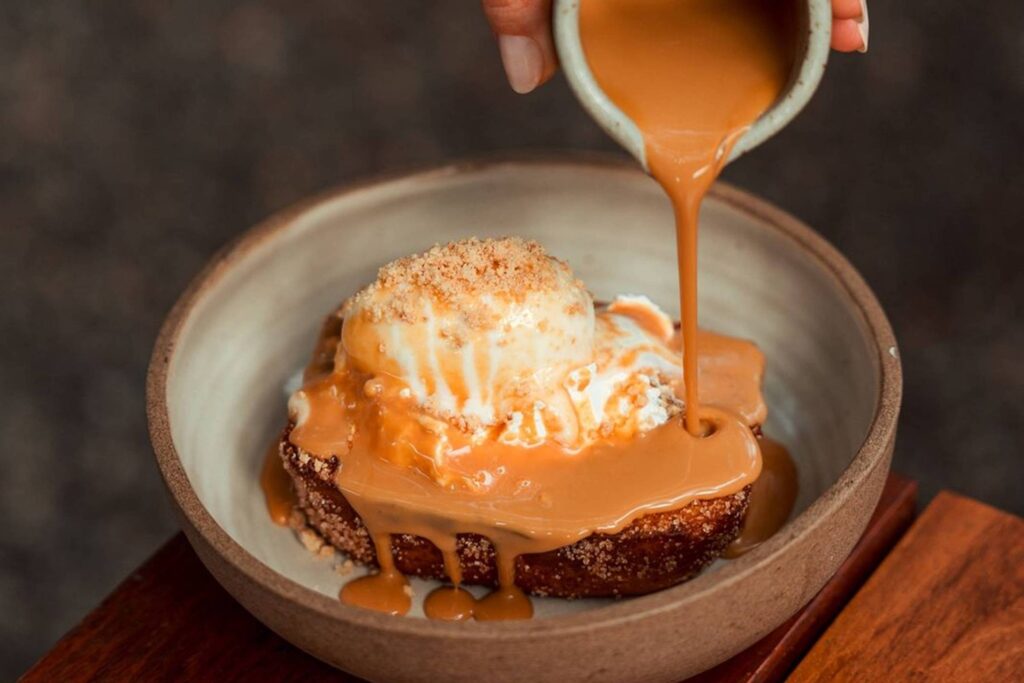 A versão do chef é servida com calda de doce de leite e pode ser acompanhada por sorvete.