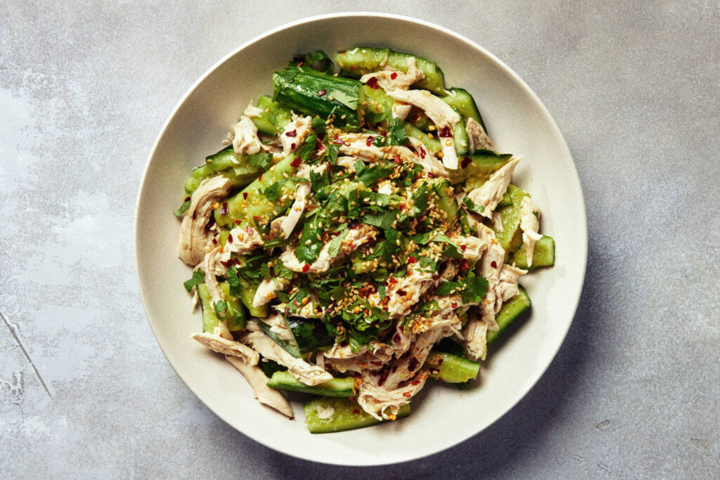Alguns elementos simples —frango assado desfiado, pepinos amassados, salgados e escorridos, e um molho doce e picante— se unem rapidamente nesta salada inspirada na culinária de Sichuan, região da China. O resultado final: um prato principal fresco, crocante e saboroso, servido frio sem tempo de cozimento, perfeito para os dias quentes quando ligar o fogão parece uma tarefa de difícil.