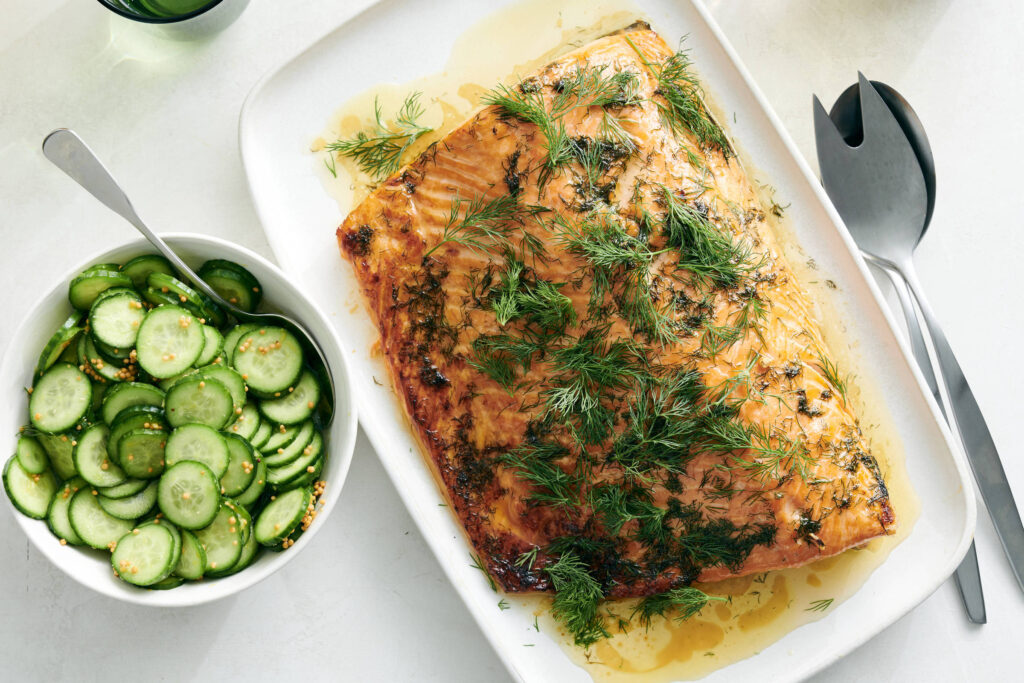 Revestido com uma mistura picante de mel e limão, este salmão carameliza nas bordas, mas continua suculento e macio. Uma boa quantidade de dill traz frescor —verde como grama cortada. A versão selvagem do peixe combina bem aqui, pois a manteiga no molho confere riqueza ao pescado magro. (O salmão de cativeiro, com gordura, simplesmente terá um sabor ainda mais rico, o que não é nada ruim.)