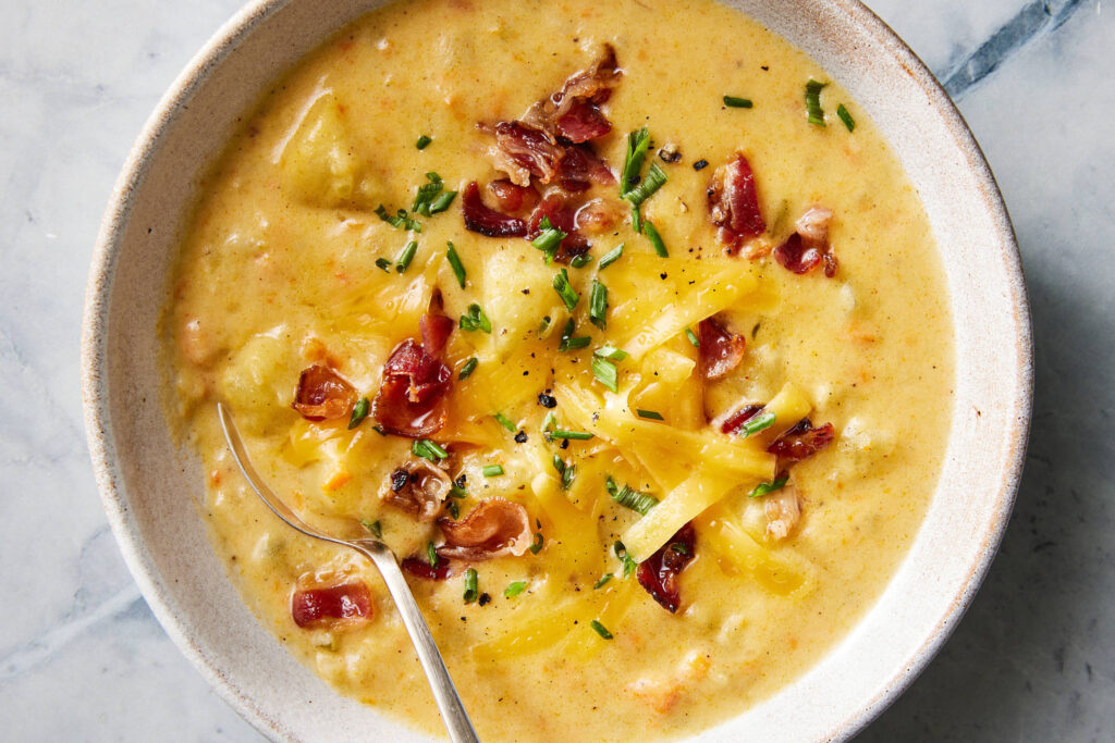 Transfira metade da sopa para um liquidificador e bata até ficar homogênea. Volte a sopa batida para a panela e cozinhe em fogo médio baixo, sem tampa e mexendo ocasionalmente, até engrossar levemente, por cerca de 15 minutos. (Como alternativa, você pode usar um mixer de imersão e bater cerca de metade da sopa diretamente na panela.) Adicione mais creme de leite, sal e pimenta, se desejar, e sirva em tigelas com bacon, queijo e cebolinha por cima.
