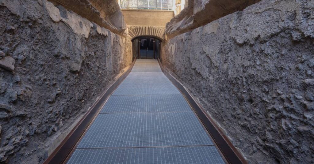 Escavada entre o final do século 1 e o início do século 2, a galeria subterrânea foi um acréscimo ao projeto original do Coliseu, inaugurado em 80 d.C. O corredor ligava a área externa do anfiteatro diretamente à tribuna do imperador, ou seja, era um caminho reservado, digno da figura que comandava o Império Romano.