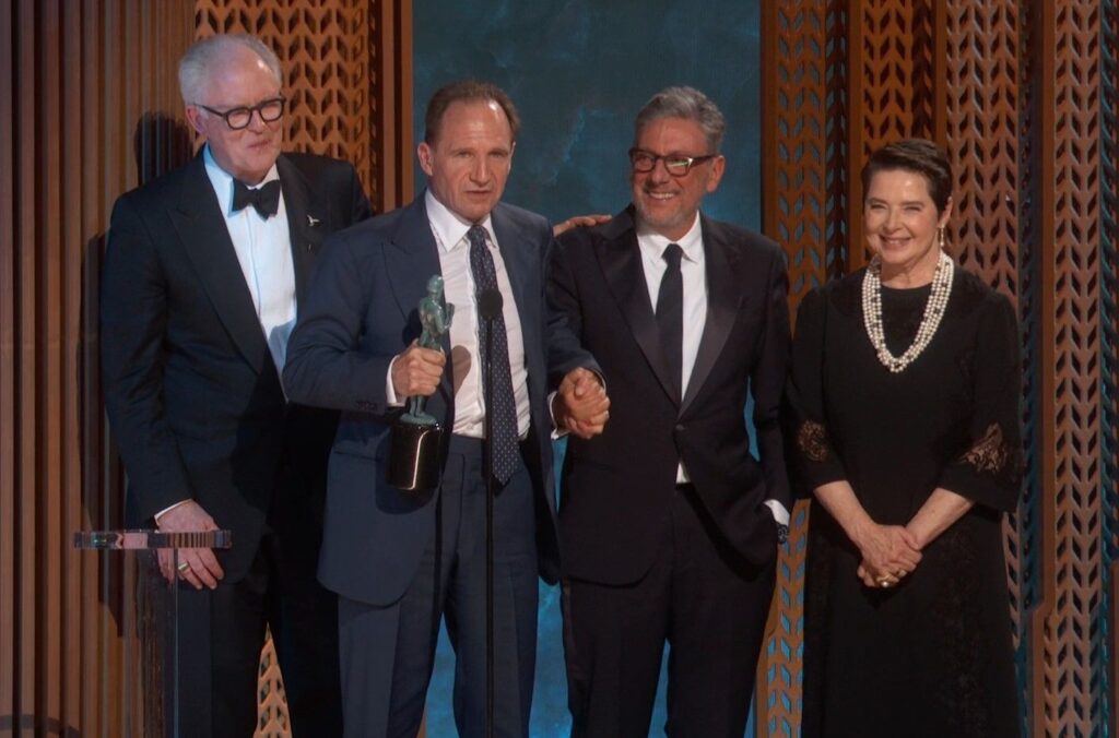 A principal categoria do SAG Awards foi anunciada já na madrugada desta segunda-feira (24) e consagrou o filme “Conclave” como o Melhor Elenco da temporada. Os atores John Lithgow, Ralph Fiennes, Sergio Castellitto e Isabella Rossellini subiram ao palco para receber a estatueta.