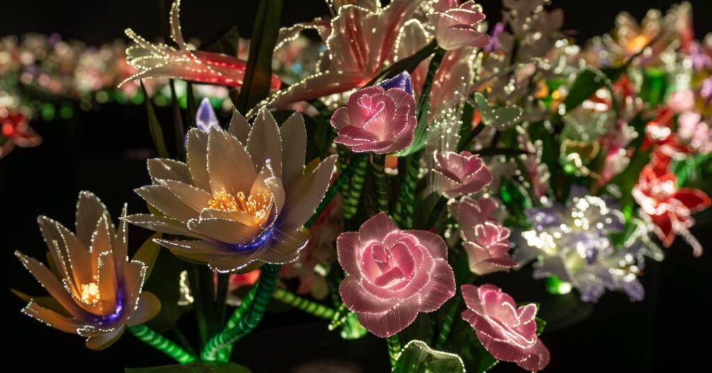 A instalação é formada por centenas de flores artificiais que produzem um efeito semelhante ao produzido pela fibra óptica. Elas piscam, mudam de cor e criam uma ilusão de movimento que engana o olho, como se estivessem dançando. “Não é um material muito tecnológico, eu faço low-tech. São materiais muito simples, é uma luz, é um círculo de plástico e são flores de plástico também. Portanto, é o efeito que cria, parece muito tecnológico, mas na verdade não é muito”, explicou Joana.