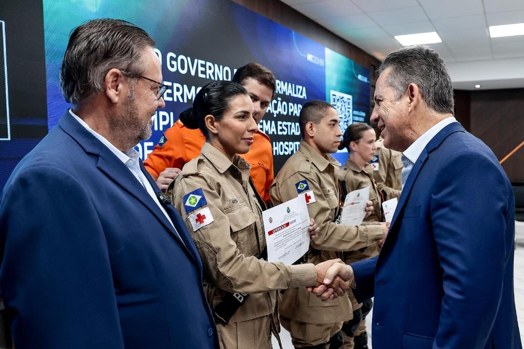 “Nós temos absoluta convicção de que essa nova modalidade de serviço, que começa a migração nos próximos dias, vai trazer uma melhora substancial de rapidez, de eficiência, além das tecnologias que nós estaremos incorporando”, afirmou o governador Mauro Mendes, durante a formatura de 102 bombeiros temporários no curso de Atendimento Pré-Hospitalar, no Palácio Paiaguás.