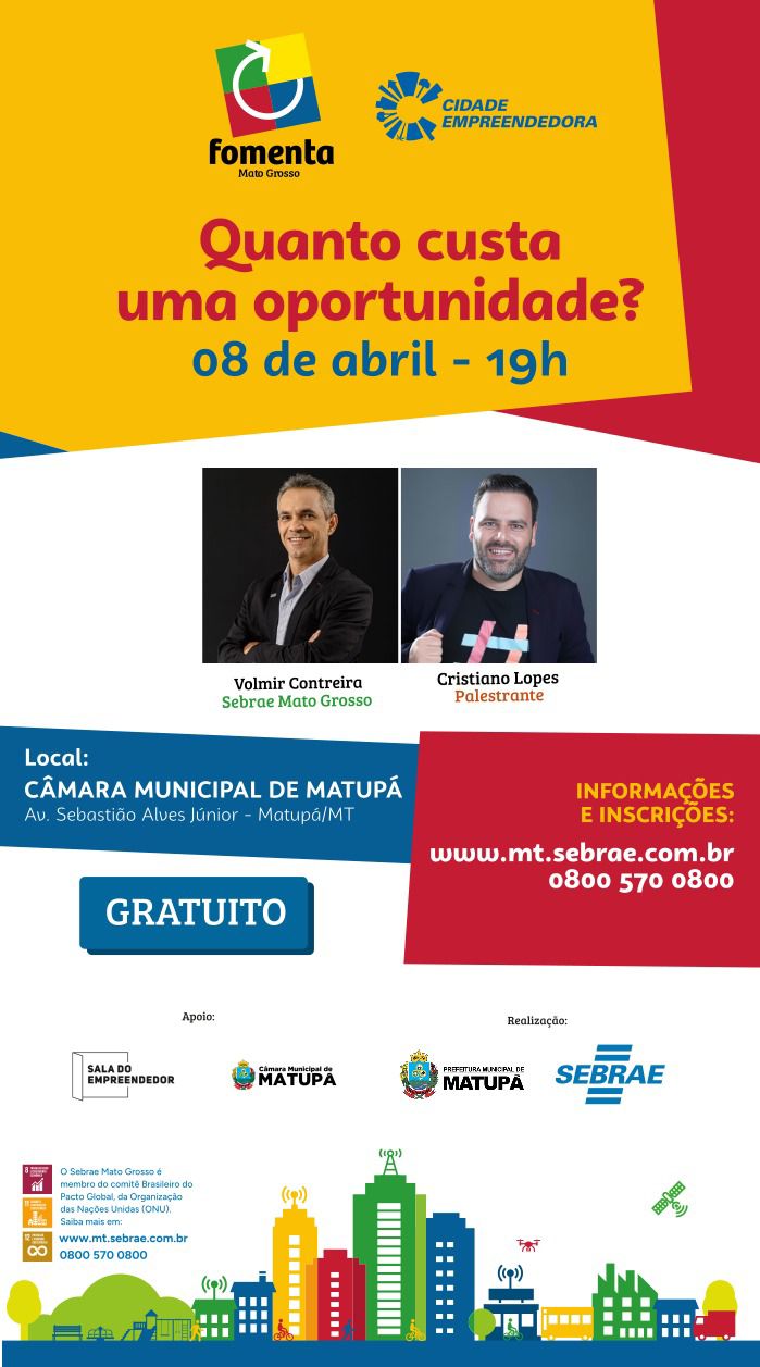 Gratuito e com vagas limitadas, o evento será realizado às 19h, na Câmara Municipal de Matupá. A iniciativa conta com o apoio da Sala do Empreendedor e do Legislativo Municipal.