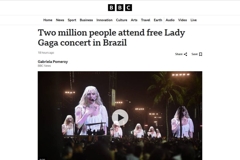 A imprensa internacional estava de olho no show de Lady Gaga no Brasil, realizado neste sábado (3). Veículos britânicos, como The Guardian e BBC, e os norte-americanos Washington Post e Associated Press destacaram o “maior show da carreira” da artista até hoje, com ênfase na gratuidade do evento e no público de mais de 2 milhões de fãs que lotaram a areia da praia de Copacabana, no Rio de Janeiro.