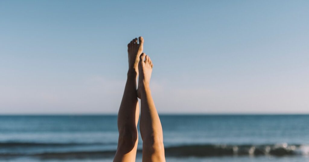 Ela segura as pontas dos pés com as mãos e deixa o sol iluminar as suas partes íntimas. Na legenda, explica que 30 segundos de exposição solar nessa região pode melhorar os níveis de vitamina D, o sono, energia sexual e, até, a criatividade.