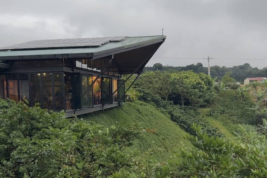 Em meio às montanhas costa-riquenhas, uma cafeteria se debruça sobre um vale cafeeiro. Ao redor, uma cordilheira com uma cachoeira em meio à vegetação nativa emoldura a vista de quem senta em uma das várias poltronas dispostas diante de uma grande sacada.