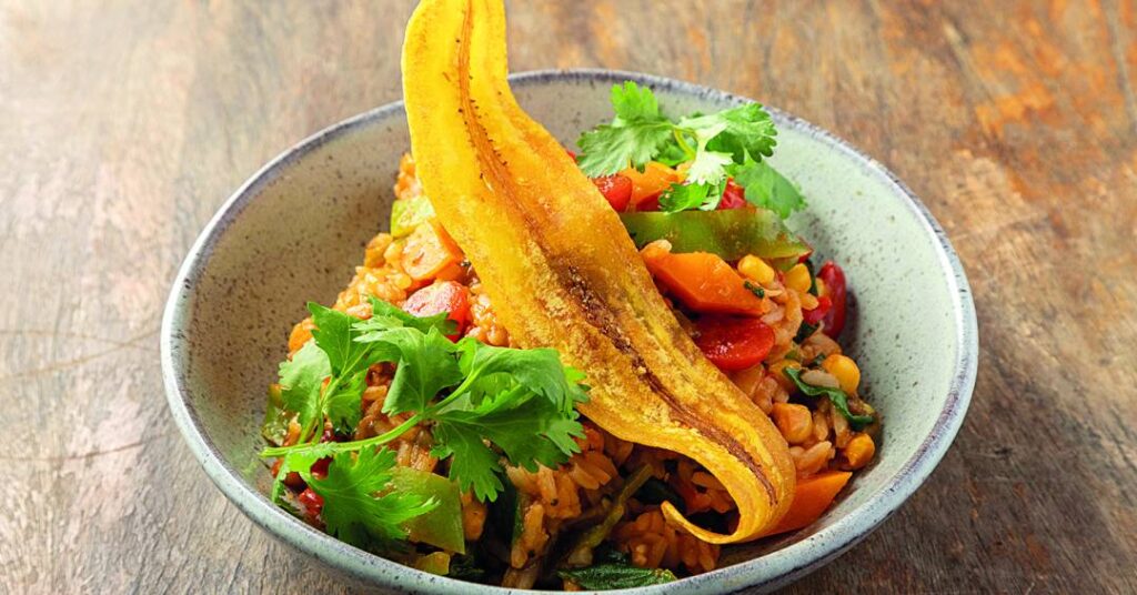 Trata-se do arroz cremoso com molho criollo (extrato e tomate fresco com cebola, pimentão e cebolinha) mais leite de coco, pimentões, espinafre, tomate-cereja, milho e chips de banana. O precinho ajuda: R$ 59,00.