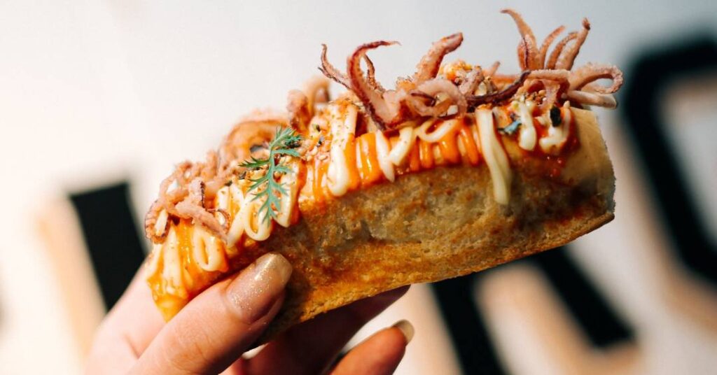 É o bocata de calamares, recheado de lulinha crocante com maionese de chipotle e furikake (topping japonês) no pão brioche (R$ 54,90).