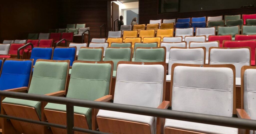 Na entrada, basta apresentar o ingresso e seguir em frente. Não há saguões monumentais nem excessos arquitetônicos. À esquerda, o espaço se liga ao Instituto, onde ficam os banheiros de portas azuis – simples, limpos e funcionais – e o restaurante que serve refeições diárias aos alunos. Lá, há também um elevador e placas indicando que, nos pisos superiores, estão as salas de ensaio.