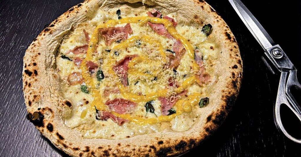 Depois de assada, a pizza bianca recebe o acréscimo de presunto cozido, creme zabaione salgado, folhas de manjericão fresco e queijo Sol, do produtor Pé do Morro do Japi, em Cabreúva (SP).