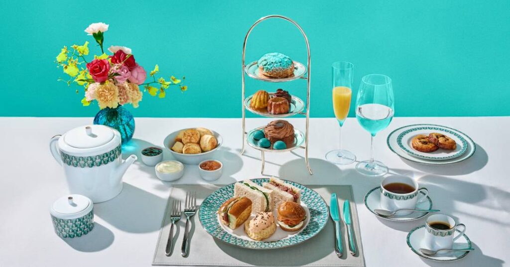 O tea at tiffany’s é a experiência do chá da tarde, com sanduíches, scone (bolinho de origem britânica) com geleia, manteiga, cafés e chás.