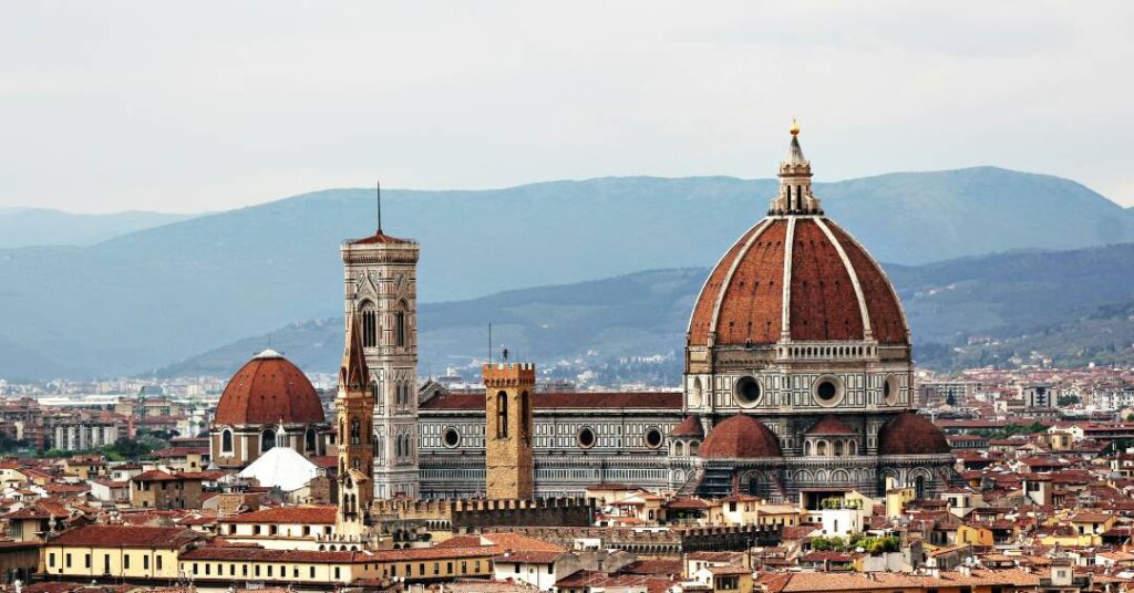 Símbolo máximo da cidade, a Catedral de Santa Maria del Fiore, conhecida popularmente como Duomo, domina o centro histórico. A fachada em mármore verde, branco e rosa impressiona, mas é sua cúpula, projetada por Filippo Brunelleschi, que rouba a cena. O interior foi decorado com afrescos gigantescos por Giorgio Vasari e Federico Zuccari, um dos panoramas renascentistas mais impactantes de toda a Itália.